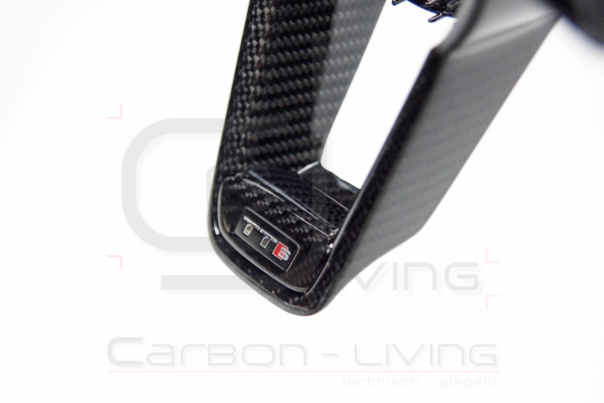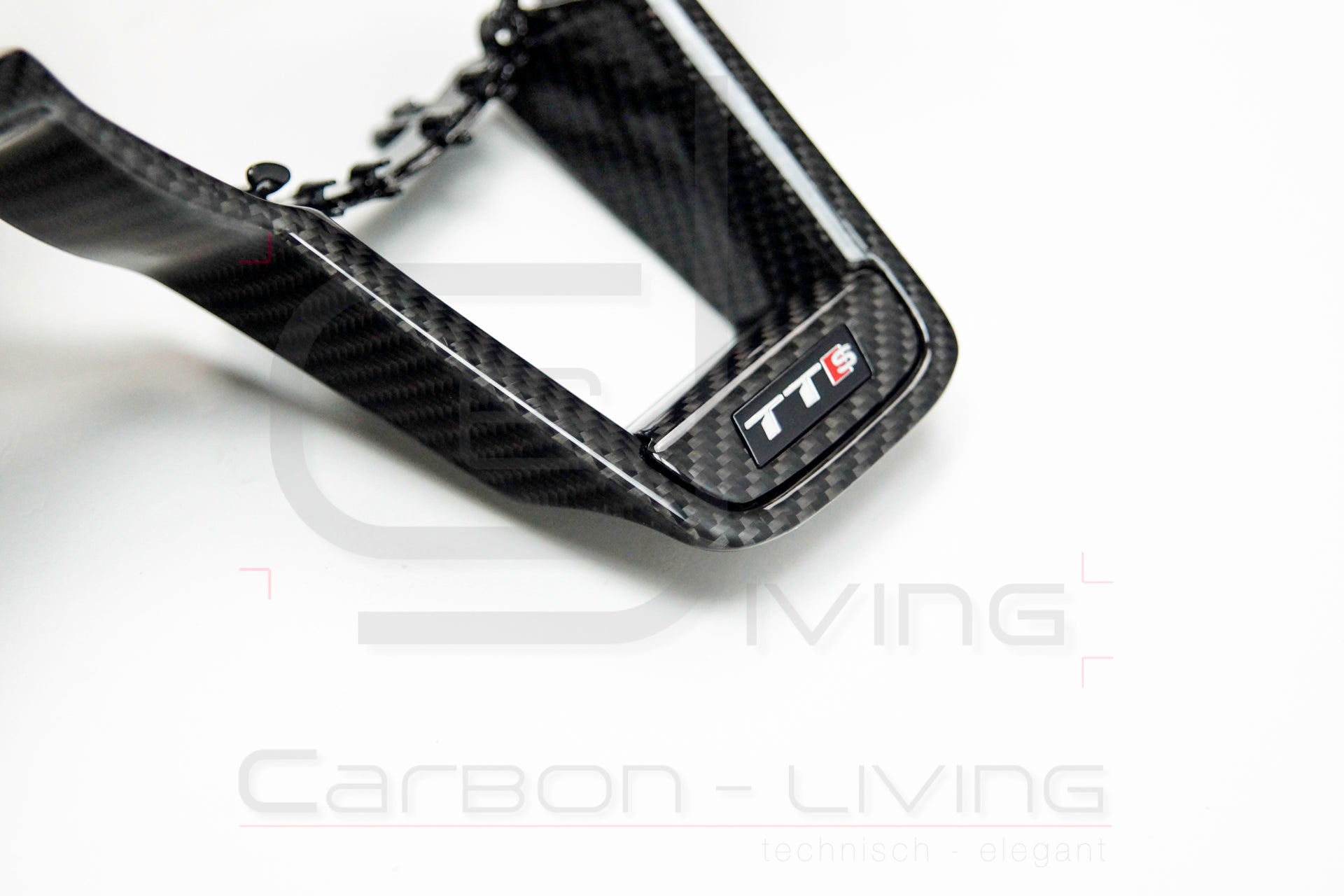 Die kleine Carbon Blende (Badge-Aufnahme) für den Lenkrad-Schriftzug kann optional auch in Carbon bestellt werden. Andernfalls wird dieses Teil in mattschwarz mit geliefert. Das TTS Badge ist nicht im Lieferumfang enthalten! Auf den Referenzbildern ist die kleine Blende für die Emblem-Aufnahme in Carbon.